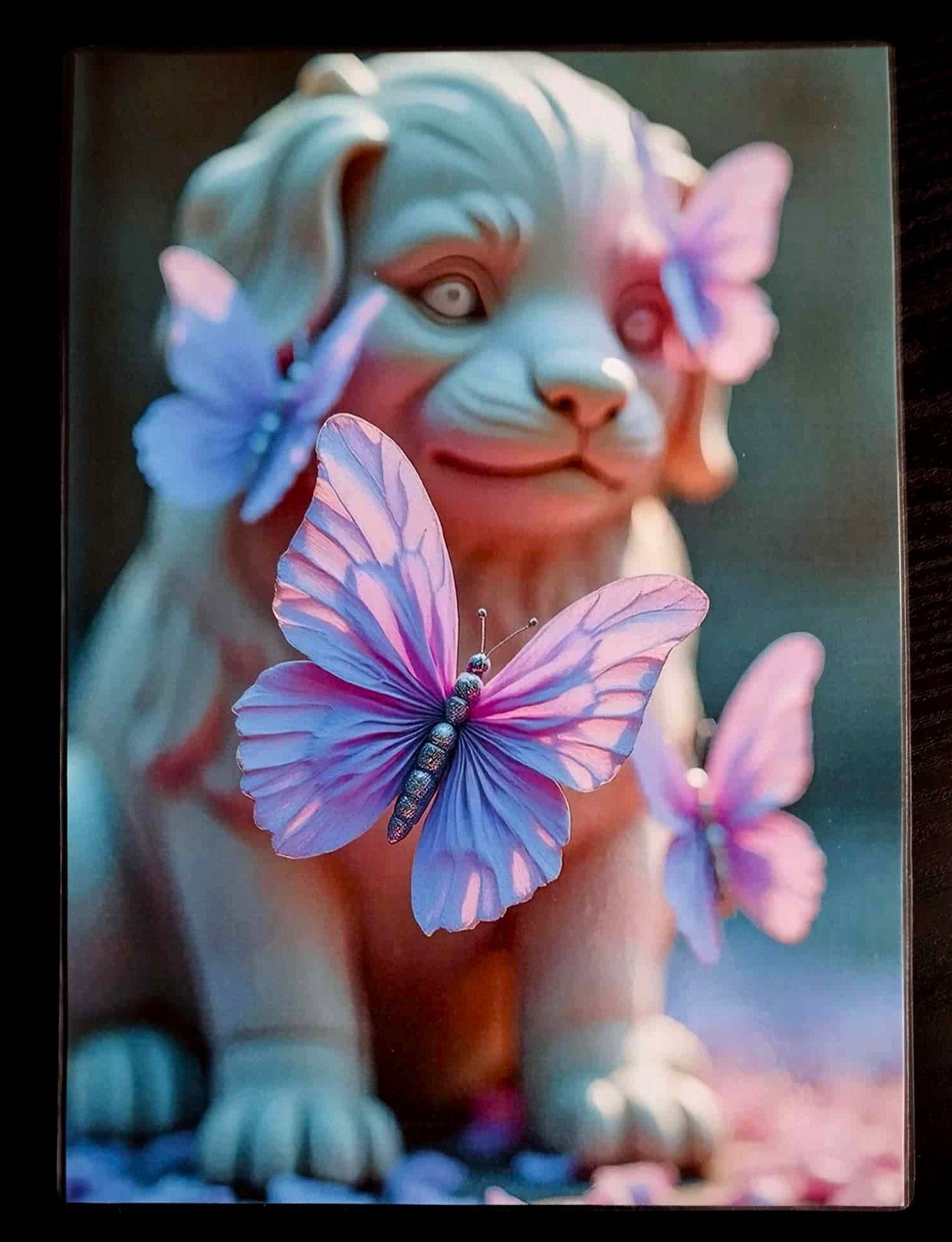 a purple butterfly born from a bouquet, an azure gleam resting on a leaf, a pastel wing that evokes dawn, a breath of colors rediscovered.