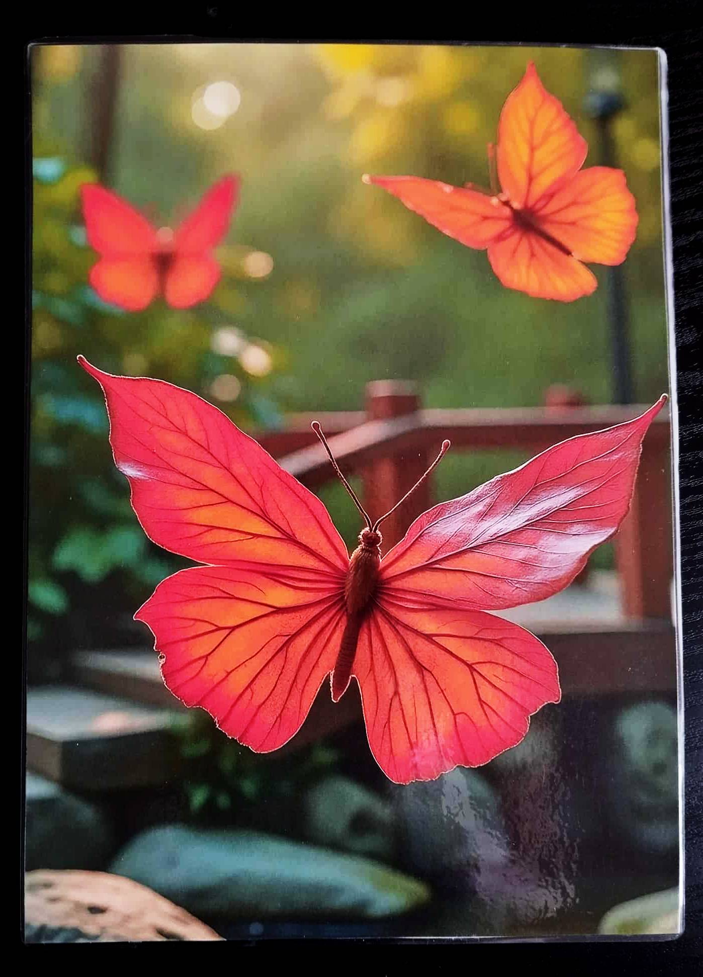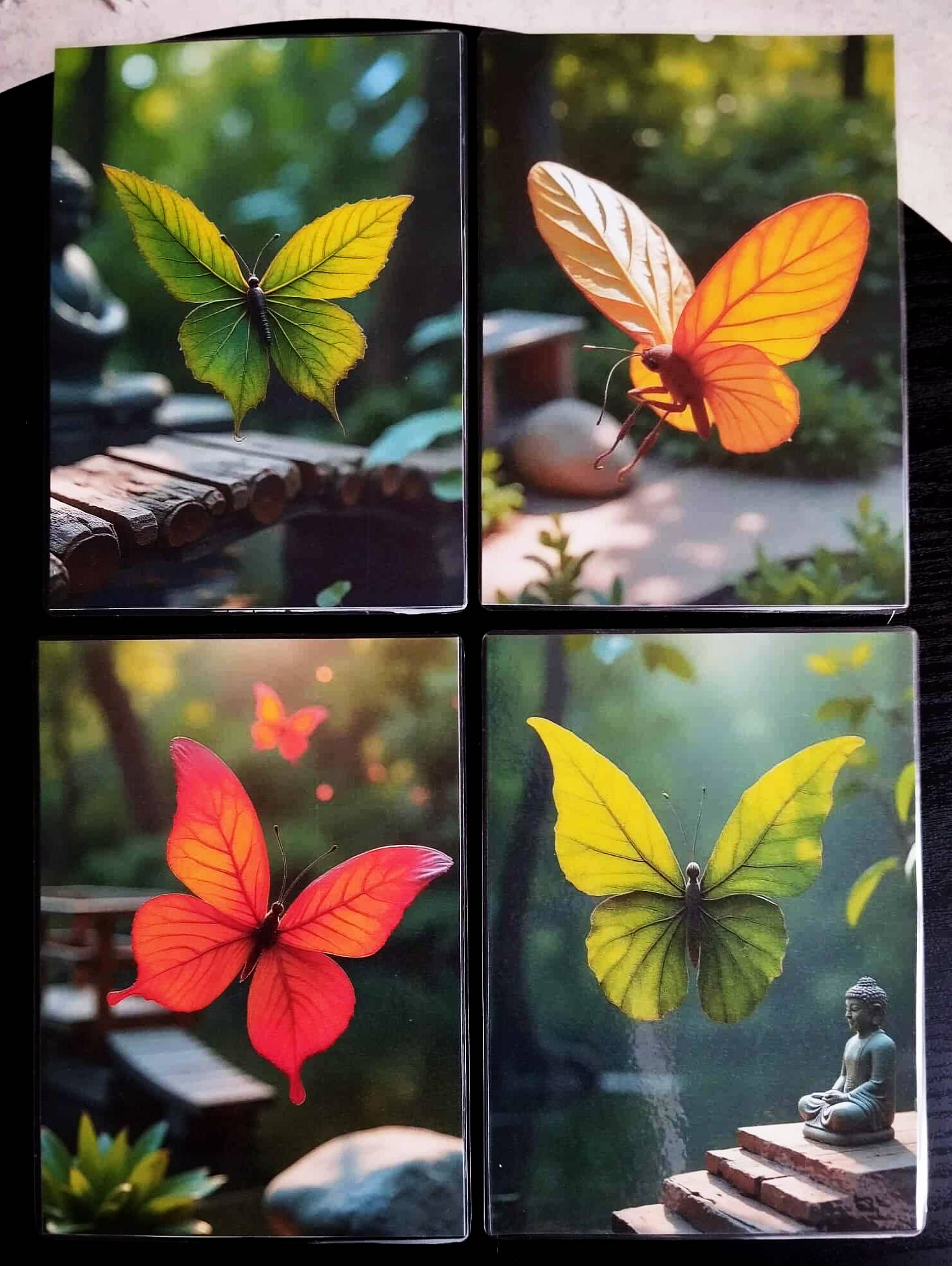 Ici, les papillons sont entièrement confectionnés à partir de feuilles réelles — découpées, assemblées et animées comme des créatures végétales renaissantes.