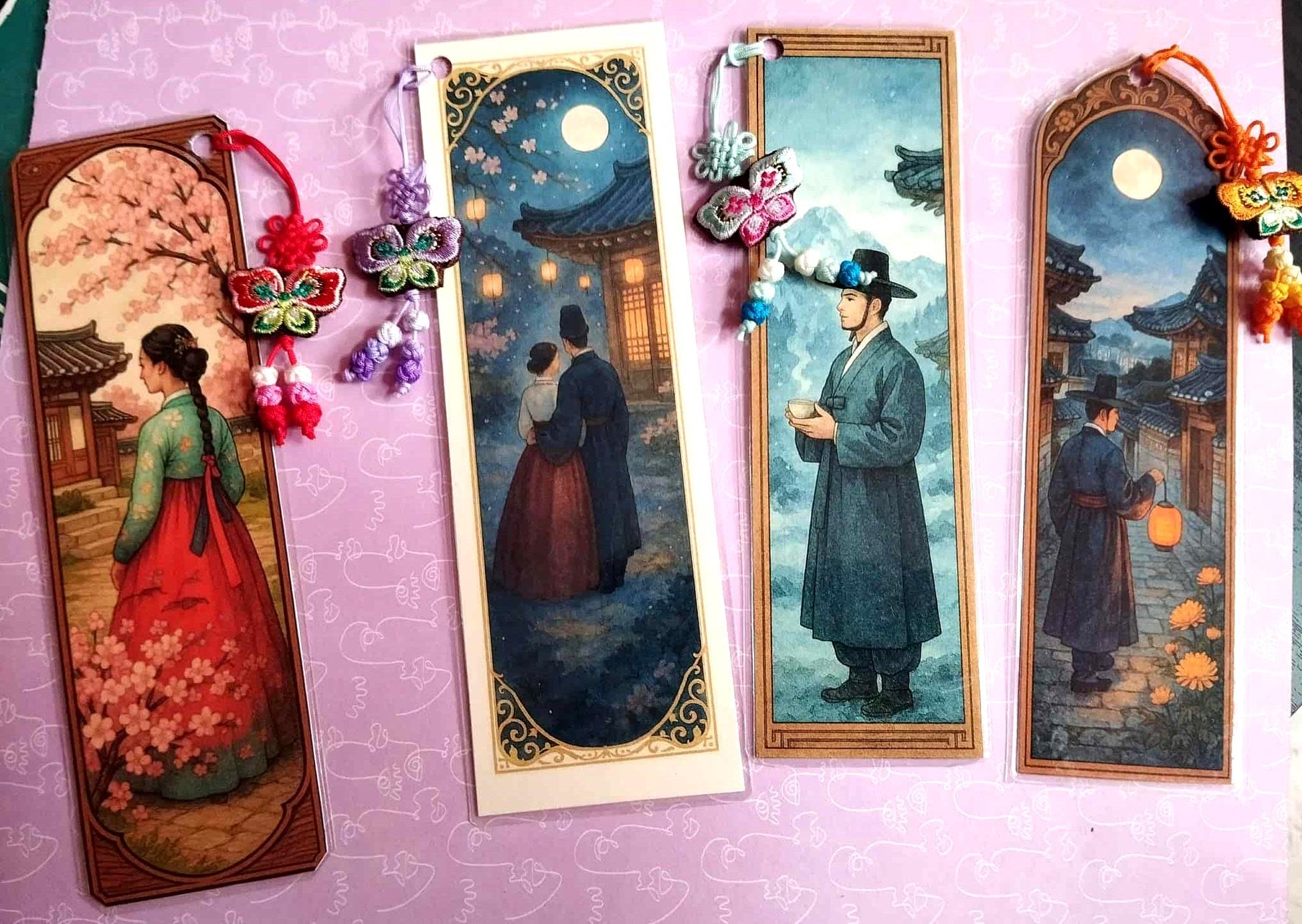 Apportez une touche de Corée dans votre quotidien avec ce magnifique marque-page coréen fait main, illustré de scènes coréennes et orné d’un nœud norigae de hanbok authentique, importé directement de Corée du Sud.