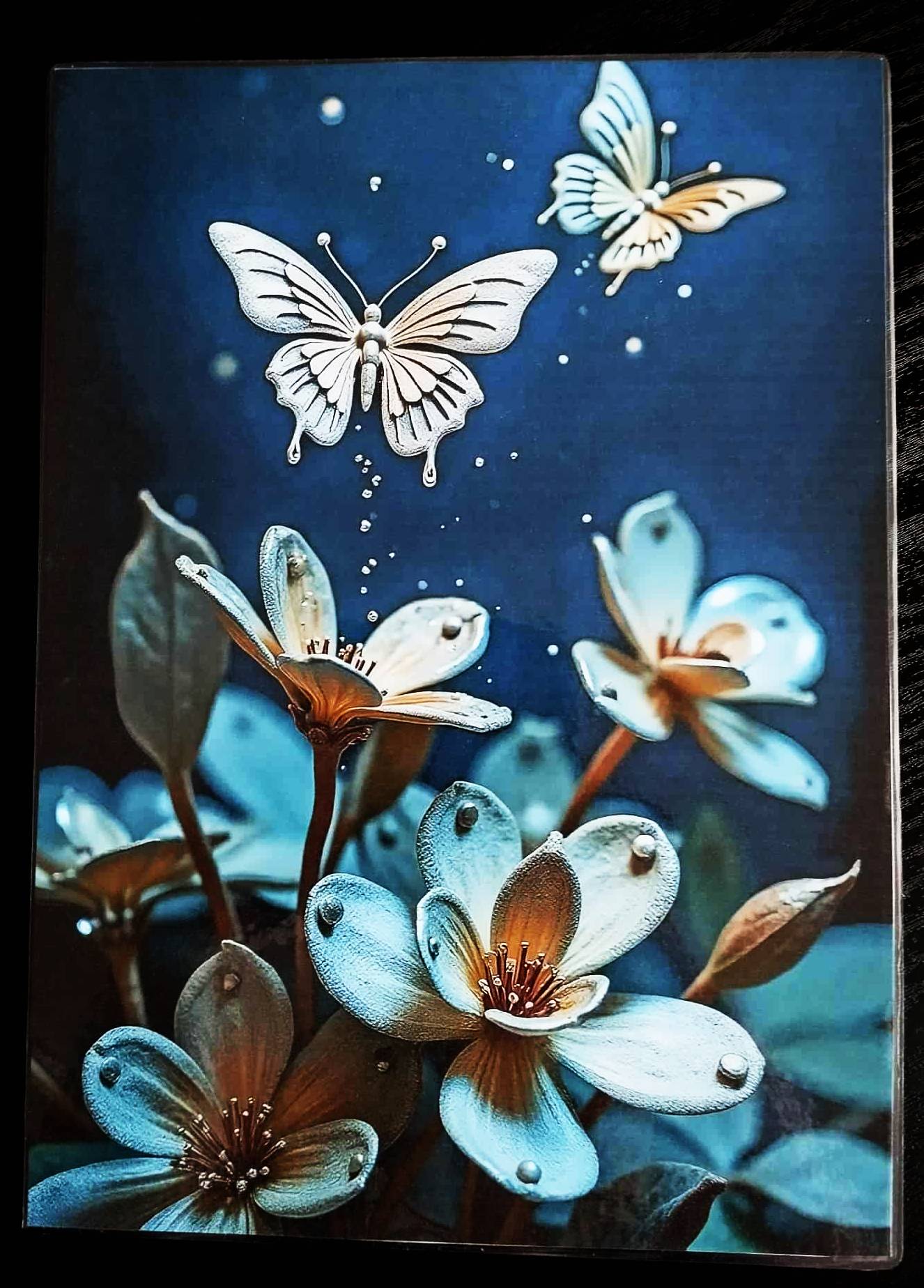 Les papillons sont forgés comme des armatures délicates, leurs ailes fines rappelant des lames polies ou des os métalliques baignés de lumière froide.