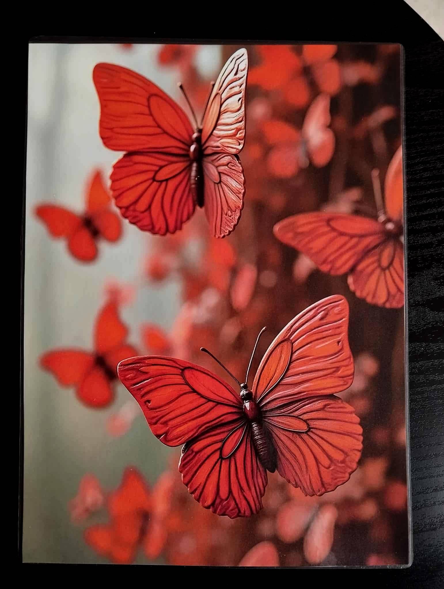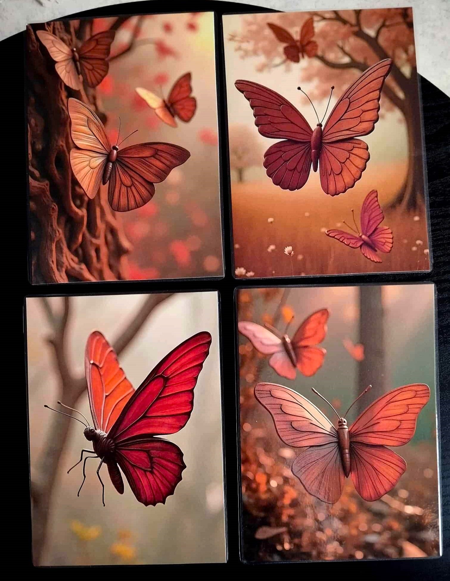 Les papillons semblent sculptés dans un acajou vivant, dont les nervures rappellent les saisons passées et la sève qui nourrissait autrefois les grands arbres.